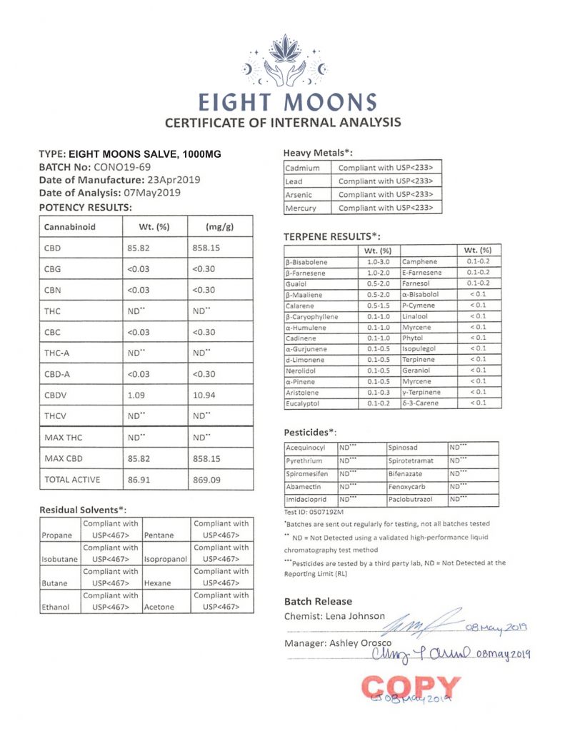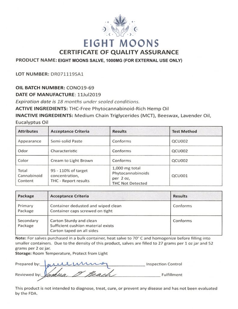 We work with independent labs across the country to test our Phytocannabinoid-Rich (PCR) Broad Spectrum hemp oil. Accurately testing our products is of utmost importance to ensure our customers receive the highest quality products in the industry. This results in a final product that is completely free of solvents and meets regulatory requirements for heavy metals and pesticides. The independent labs that we work with are qualified and capable of accurately testing the critical aspects of our products using validated test methods necessary to meet our commitment to critical quality attributes. You can trust each Eight Moons product because we hold ourselves to the highest standards possible. We would never sell anything that we would not use ourselves or give to our families and friends. We all use our products….