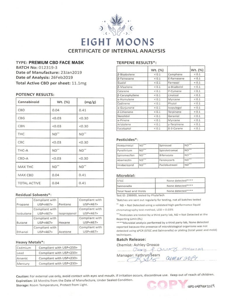 We work with independent labs across the country to test our Phytocannabinoid-Rich (PCR) Broad Spectrum hemp oil. Accurately testing our products is of utmost importance to ensure our customers receive the highest quality products in the industry. This results in a final product that is completely free of solvents and meets regulatory requirements for heavy metals and pesticides. The independent labs that we work with are qualified and capable of accurately testing the critical aspects of our products using validated test methods necessary to meet our commitment to critical quality attributes. You can trust each Eight Moons product because we hold ourselves to the highest standards possible. We would never sell anything that we would not use ourselves or give to our families and friends. We all use our products….