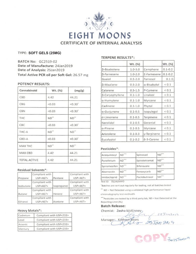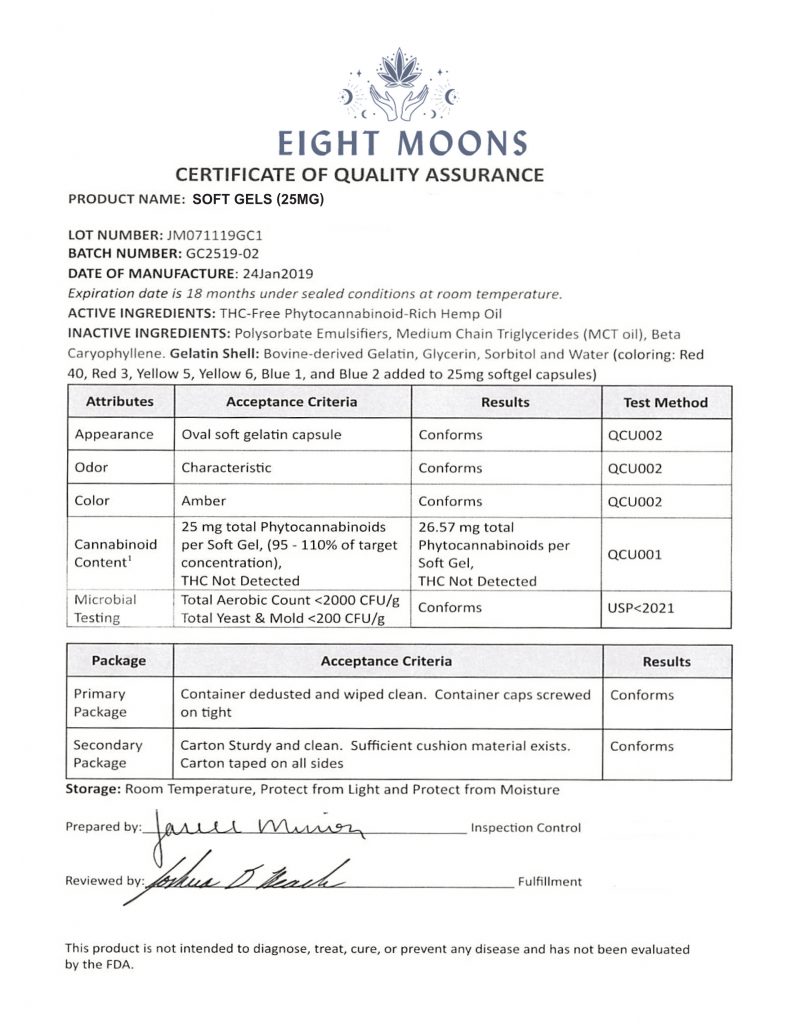 We work with independent labs across the country to test our Phytocannabinoid-Rich (PCR) Broad Spectrum hemp oil. Accurately testing our products is of utmost importance to ensure our customers receive the highest quality products in the industry. This results in a final product that is completely free of solvents and meets regulatory requirements for heavy metals and pesticides. The independent labs that we work with are qualified and capable of accurately testing the critical aspects of our products using validated test methods necessary to meet our commitment to critical quality attributes. You can trust each Eight Moons product because we hold ourselves to the highest standards possible. We would never sell anything that we would not use ourselves or give to our families and friends. We all use our products….